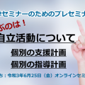 セミナー内容 #自立活動について 個別の支援計画・個別の指導計画について ☆時間の指導ってどんな内容? ☆各教科等における自立活動の指導とは? ☆指導目標設定に向けて、どのように実態把握をするの? ☆指導計画...